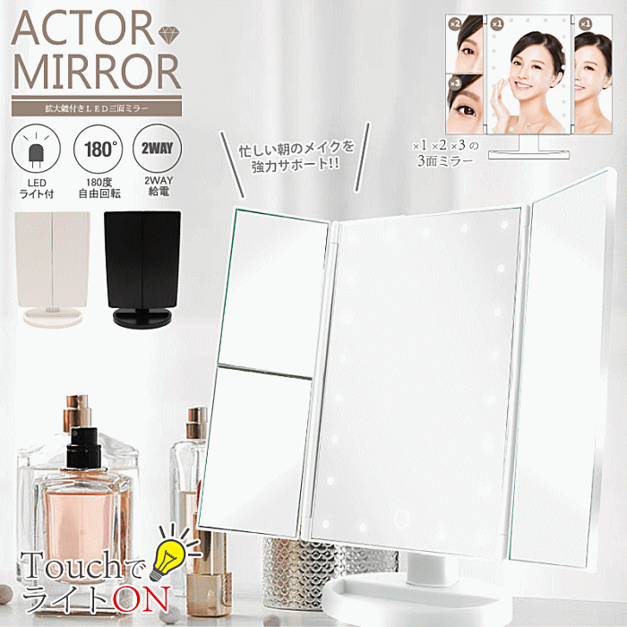 【4657】☆7【送料無料】アクターミラー 女優ミラー拡大鏡付きLED三面ミラー【HCED-AMLM】ブラック卓上鏡/卓上ミラー/21個のLEDライト/三面鏡LED付/180度自由回転2WAY電源(乾電池・USB)※北海道・東北・信越・沖縄・離島は追加送料あり※