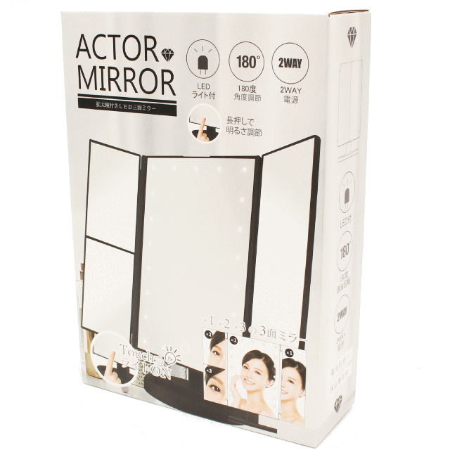 【発売元メーカー】株式会社 ヒロ・コーポレーション 0120-123-187忙しい朝のメイクを強力サポート! アクターミラー 拡大鏡付きLED三面ミラー 【HCED-AMLM】 ●21個LED付き 21個のLEDライトが付いております。